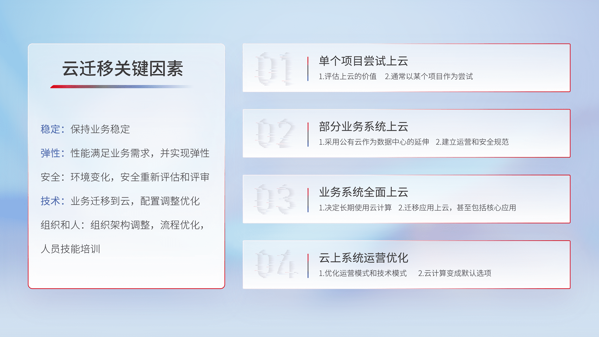 结合实际业务,,,,从规划设计、、云平台选型、、云原生改造、、数据迁移、、、、集成交付,,,迁移全过程为客户识别最佳上云路径,,,,做好风险识别管理,,,设计网络架构、、、、身份权限、、、、安全审计合规、、操作审计、、、、日志审计、、、、监控告警策略、、多站点容灾设计等,,对云上基础设施进行整体规划,,提升IT治理水平,,,以满足弹性、、、高可用、、高性能的需求。。。。