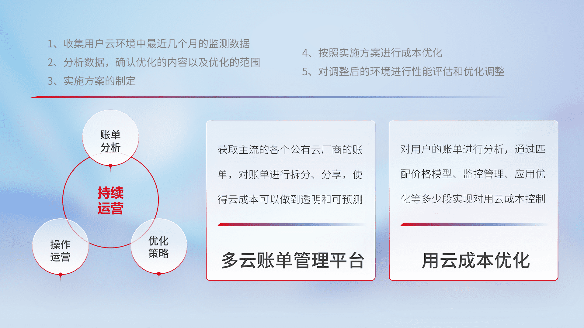 通过多云纳管,,,,以统一的资源数据模型把客户的云资源进行抽象和封装,,进而实现对多云资源的统一操作,,,保障云资源管理的可靠性、、稳定性与可用性。。。。量身定制化运维内容,,,,配置、、、、开发运维、、、补丁管理、、备份、、、监控、、、认证和访问管理、、审计和日常巡检等,,,保障在用云过程中的可靠度,,,稳定度以及高可用率。。。